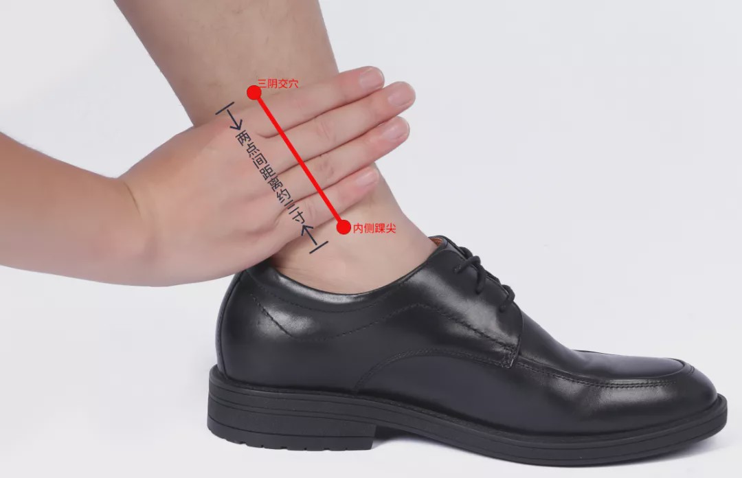 三阴交穴是身体的一个穴位,三阴,就是足三阴经,交,交会,三阴交穴指足部的三条阴经中气血物质在本穴交会。本穴有脾经提供的湿热之气,有肝经提供的水湿风气,有肾经提供的寒冷之气,三条阴经气血交会于此,故名三阴交穴。至于如何判断三阴交的位置,以内脚踝的踝尖为起点,往上约三寸(大约4指)的地方,大家可以参考下面的示意图。